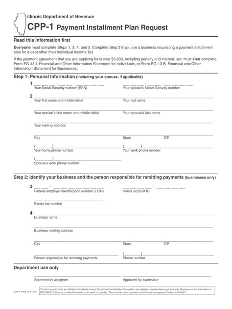 Cpp-1 Illinois Form. Other than individual income tax (i.e., sales, withholding, excise, or business income. If you are requesting an installment payment plan for more than one type of tax.