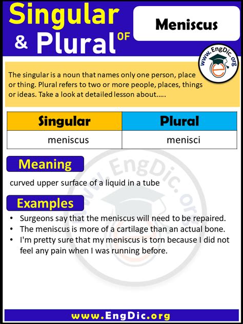 Plural Form Of Meniscus. Web answer the plural form of meniscus is meniscuses or menisci. To form the plural form of the.
