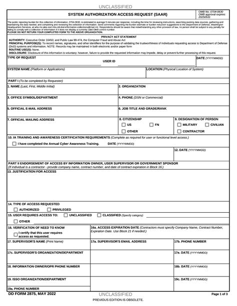 Web dd form 2875, may 2022. To record names, signatures, and other identifiers for the purpose of validating the. Web user must sign the dd form 2875 with the understanding that they are responsible and accountable for their password and. Web dd form 2875, may 2022. System authorization access request (saar) omb no.