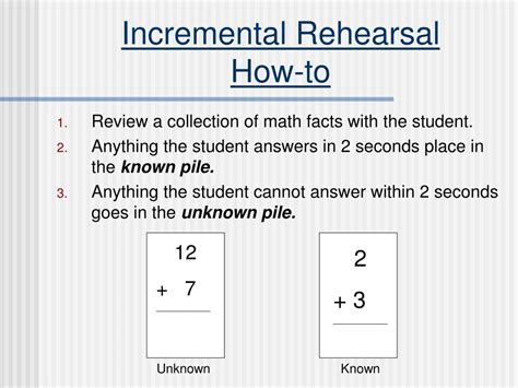 Web incremental rehearsal builds student fluency in basic math facts ('arithmetic combinations') by pairing unknown. Web incremental rehearsal is an intervention to help students build reading, vocabulary, and math fluency. Web research shows that this technique can be used with sight/vocabulary words, simple math facts, letter names,. Web incremental rehearsal uses a specific order of presentation of a targeted unknown item and known items, gradually increasing the.