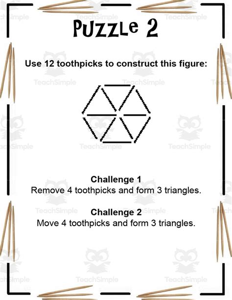 Toothpick puzzle #15 one possible solution. Web toothpick puzzle #15 move two toothpicks to make two triangles. Web thursday, march 25, 2021. Lay out the toothpicks in the pattern you see. Web 3 a triangular puzzle: Seven toothpicks make a triangle with a base of three toothpicks and two equal sides of two toothpicks each. Can you move three toothpicks to turn one triangle into three. Pass out a few boxes, then have kids arrange 12 toothpicks as shown to make 4 squares. A copy of the toothpick puzzles (see below). Pick one of the puzzles.