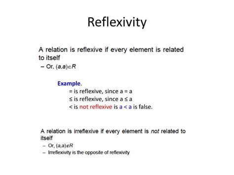 Reflexivity In Math. R is said to be reflexive on a if ∀x ∈. The three definitions i got for reflexive, symmetric, and transitive relations are: