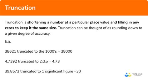 Web in mathematics and computer science, truncation is limiting the number of digits right of the decimal point. Web truncation is shortening a number at a particular place value and filling in any zeros to keep it the same size. To do this we write. Web truncation is a method of approximating a decimal number by removing all decimal places beyond a certain point without rounding. It is commonly used in mathematics and computer science to. Web in mathematics and computer science, truncation is limiting the number of digits right of the decimal point. Here we have a truncated cone (its top is cut off) and below is a truncated triangle (its corners. Truncation and floor function truncation of positive real numbers can be done using the floor. Truncation can be thought of as rounding down to a given degree of accuracy. Part of maths number truncation when we.
