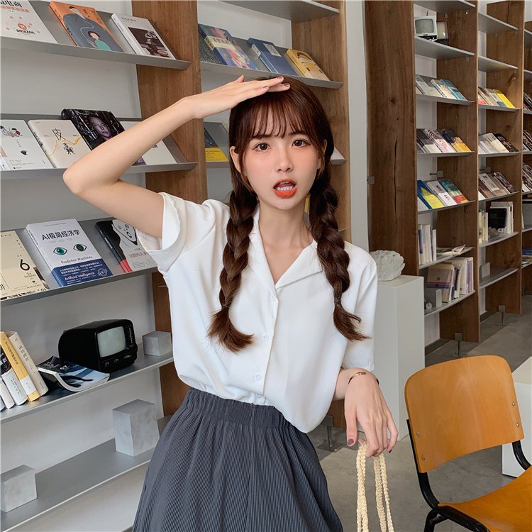 Áo sơ mi nữ form rộng công sở kiểu tay ngắn lỡ cổ vest Hàn Quốc khoác