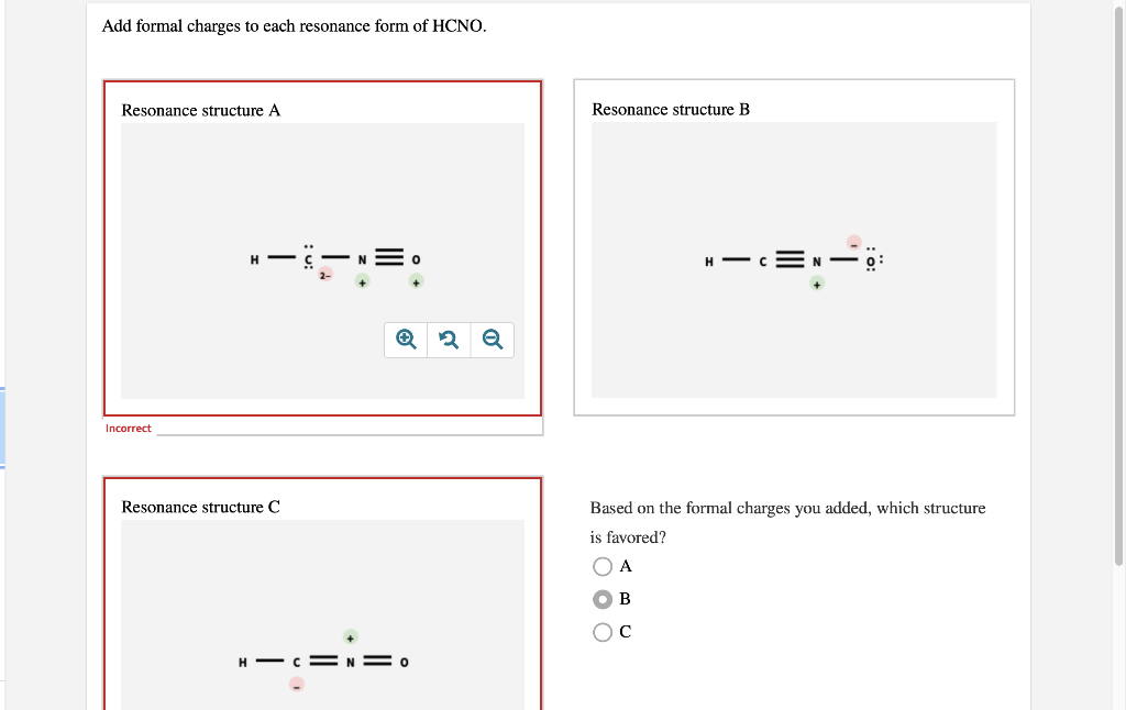 Add formal charges to each resonance form of hcno. Resonance structure a resonance structure b select rings draw more erase select draw rings more c n h. Resonance structure a select draw templates more g h c —c—n=0: The lewis structure for the resonance form c is as. Add formal charges to each resonance form of hcno below.