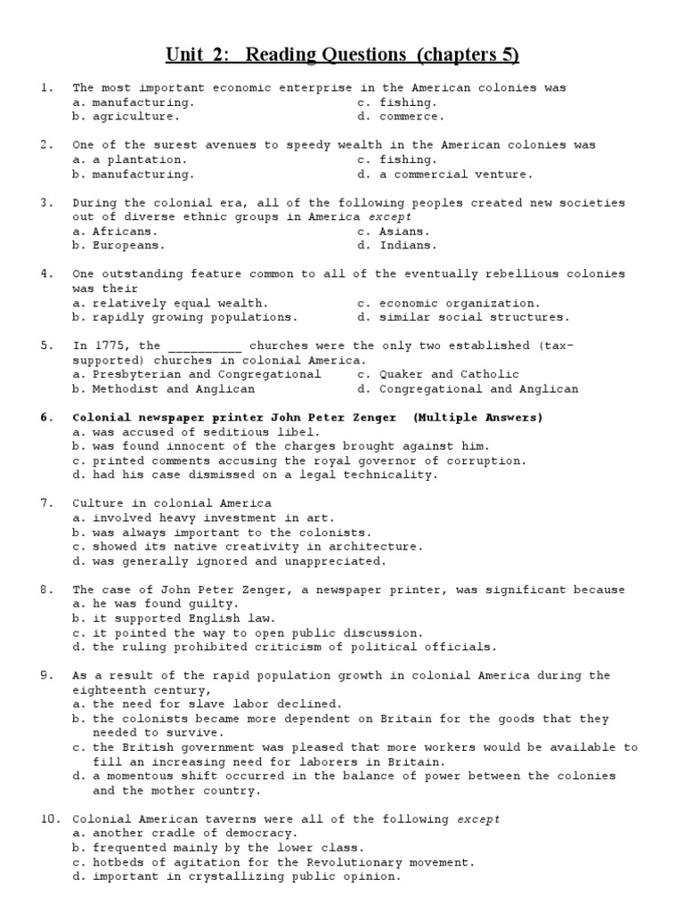 APUSH Chapter 5 Reading Questions (Unit 2) Thirteen Colonies The