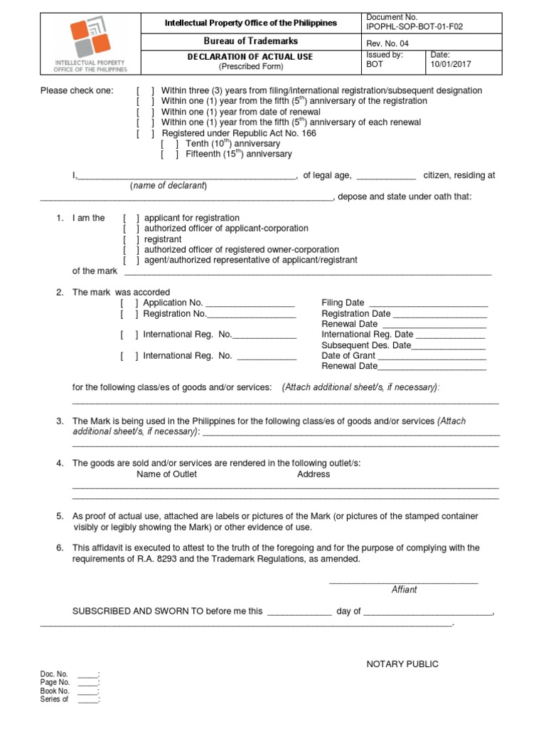 Declaration of Actual Use Affidavit Trademark
