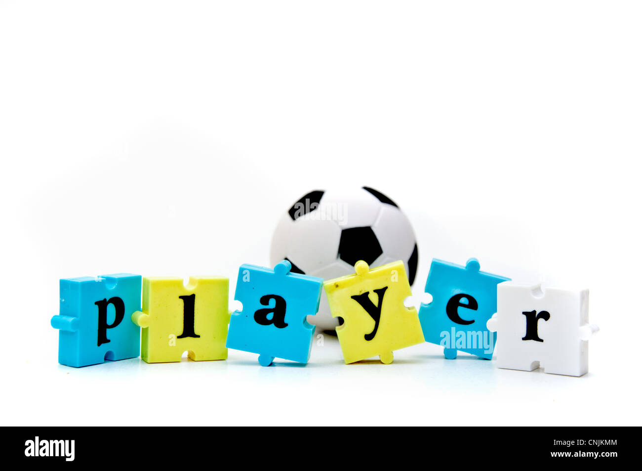 Small soccer ball and a word puzzle pieces forming a word Player Stock