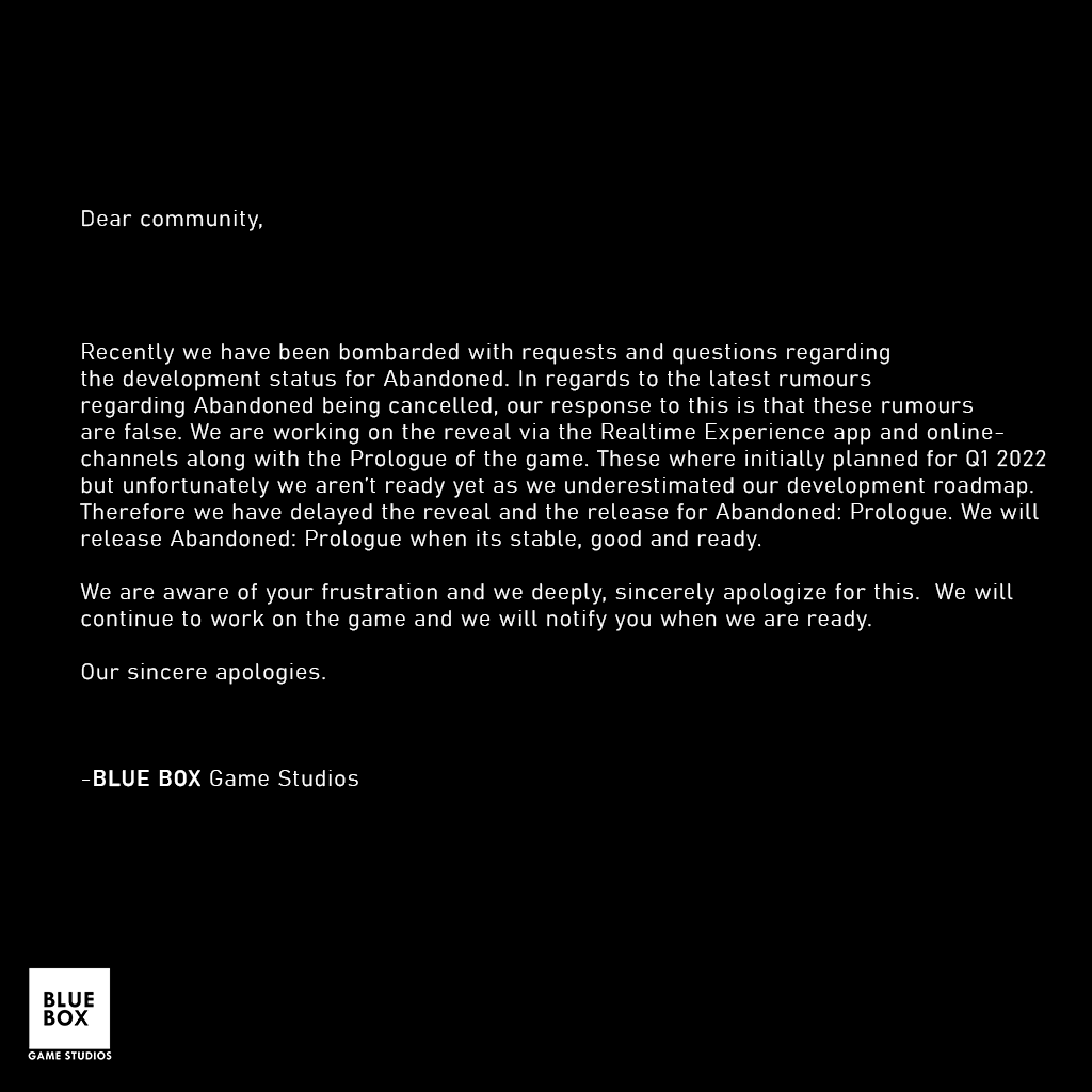 Blue Box Game Studios Has Provided An Update On Abandoned's Trailer Delay.