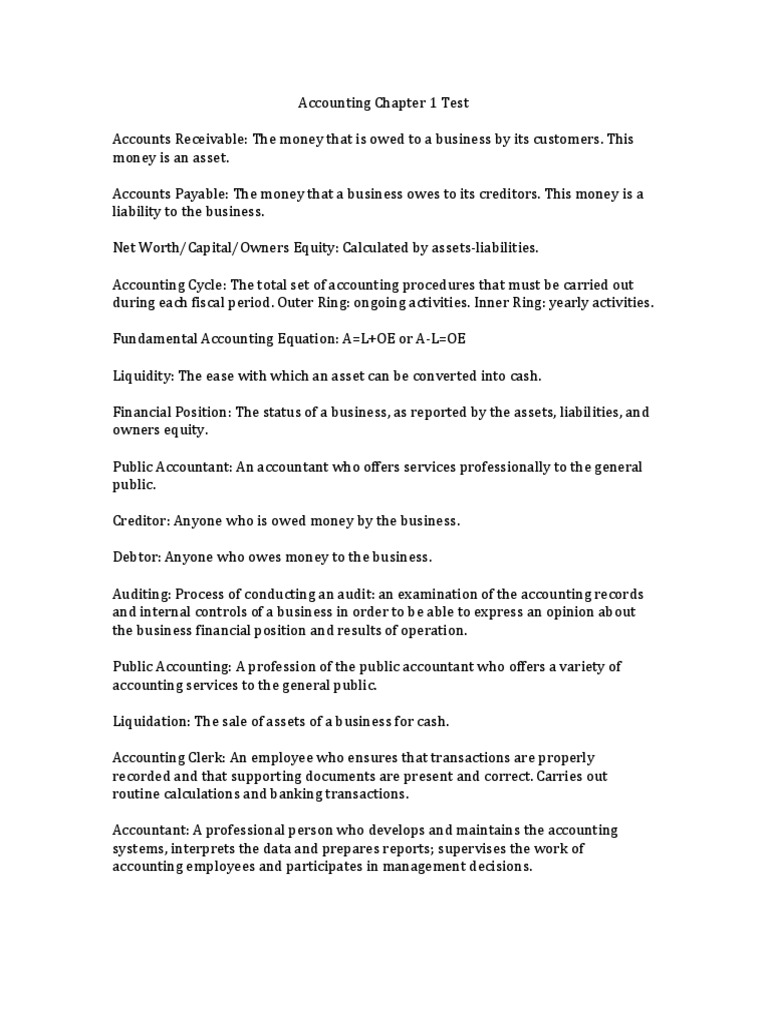 Assets = liabilities + owner's equity. Web accounting chapter 1 test review quiz for 10th grade students. Web 1) system of controls 2) external auditors 3) board of directors accounting the art of recording, classifying and summarizing transactions, in terms of money, and interpreting the results. Web the name given to an account. Find other quizzes for other and more.