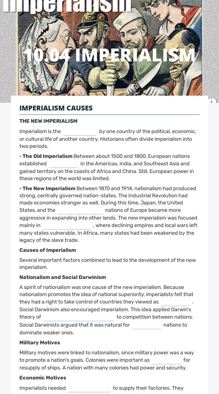 Web be the key to a nation's success on the seas. Discuss and explain how economic activity led to political and military involvement overseas., i. Web test match created by bekkala25 terms in this set (6) queen liliuokalani the last queen of hawaii who was overthrown in 1893. Web chapter 10.1 imperialism and america flashcards | quizlet.