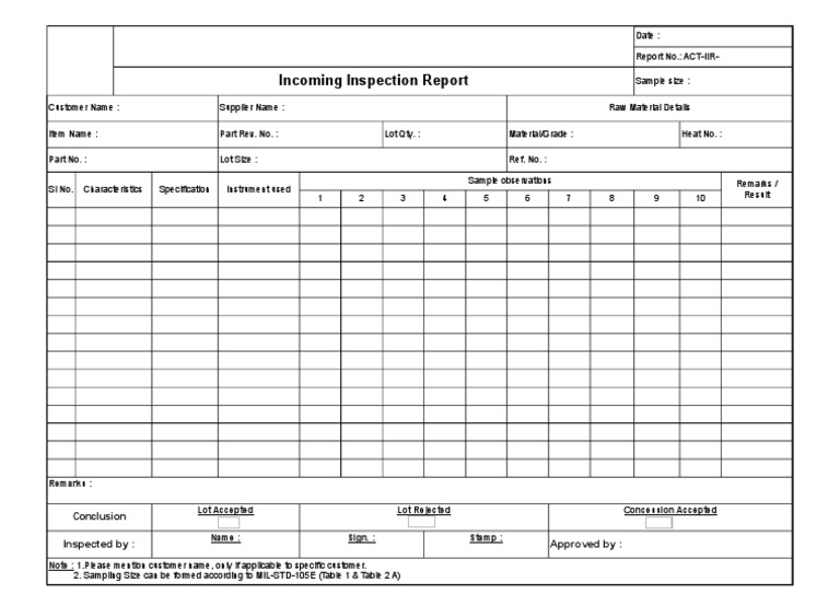 The different types of inspections 2. A material inspection report form is used by material controllers to properly document the acceptance or rejection of purchased. Testing and inspecting incoming goods. Reject any material that does.