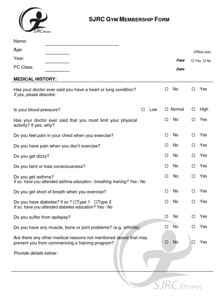 It is a membership form that eases the process of collecting, processing, and managing client registration. Web download now of 2 sjrc gym membership form name: Yes no if yes, please specify: The undersigned persons consent to the member using the gym training facilities and are aware of the risks involved in such use. Enlist questions for a medical questionnaire.