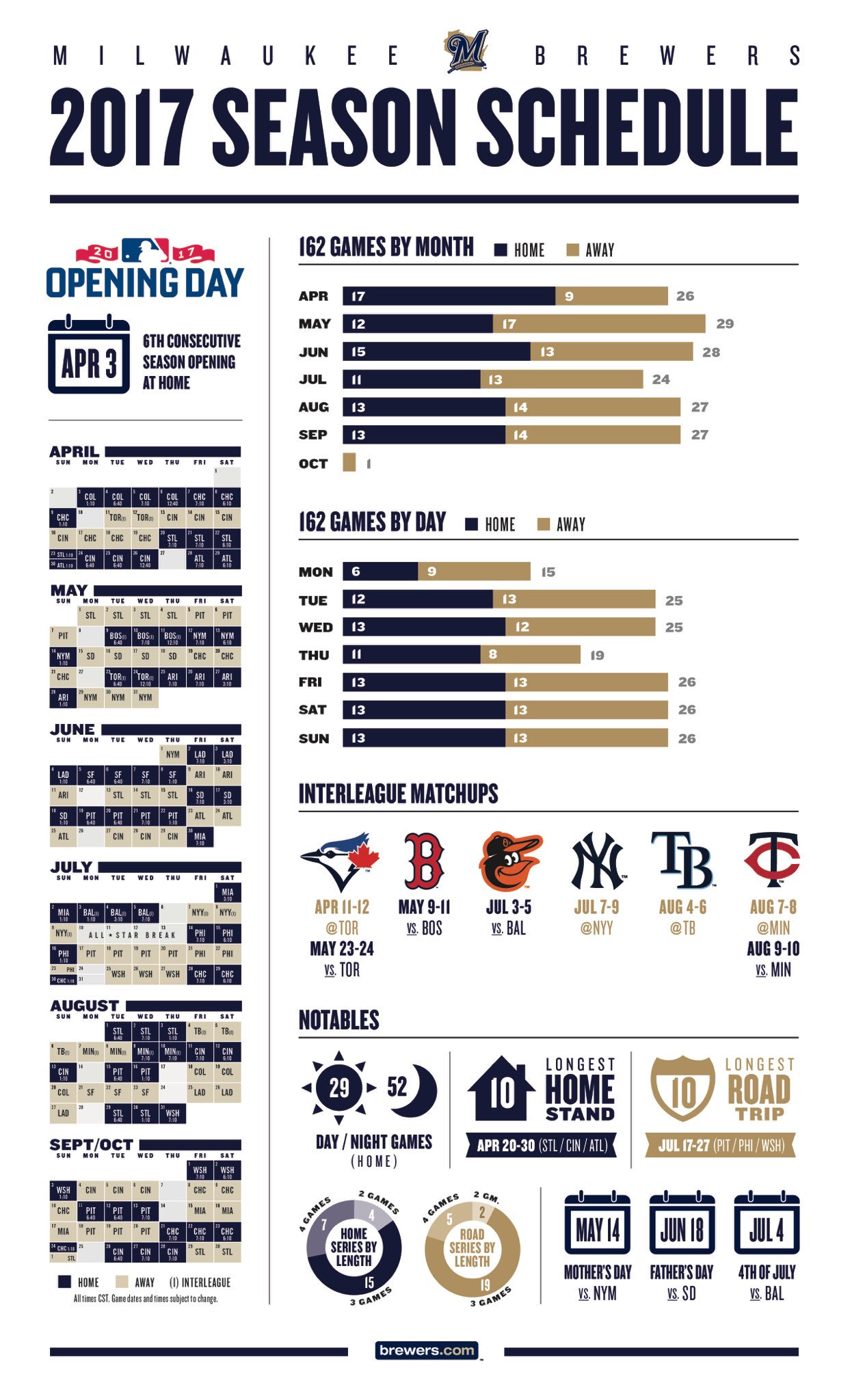 Dates/times are subject to change. Hang it on your refrigerator or by your desk for a quick and easy reference. Cdt against the arizona diamondbacks at american family field. Milwaukee will open at home for the second consecutive season and for the ninth time in the last 11 years. Web anthony castrovince @ castrovince the 2023 schedule released by major.