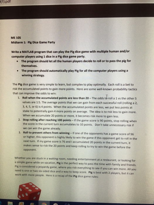 Solved Write A MATLAB Program That Can Play The Pig Dice