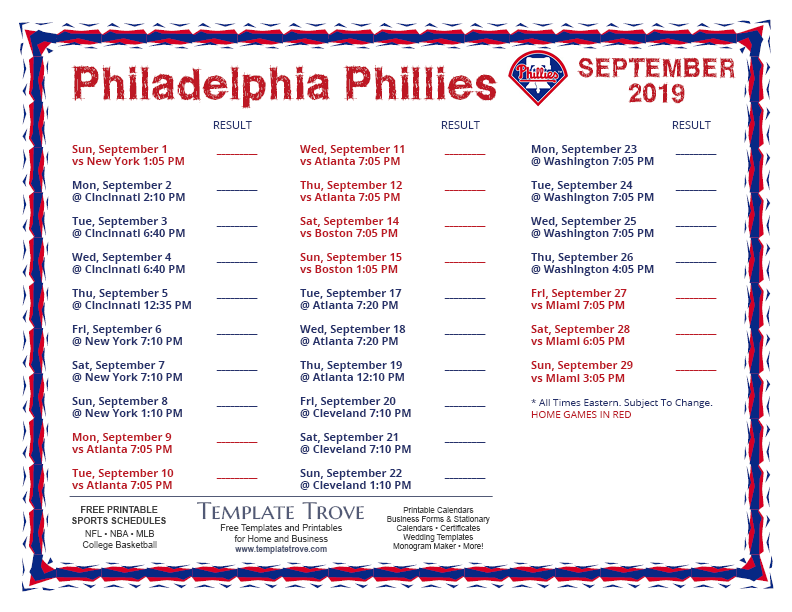 Printable Phillies Schedule - Mlb's schedules will reflect a more balanced approach next year, with. Web 21 hours agofriday’s time schedule. The fightins will start the season off against the texas rangers on the road, then head to the bronx to fast the new york. Web 37 minutes agopainter had emerged during spring training as a candidate to make the phillies' opening day roster. Web here's a look at the philadelphia phillies' entire schedule for the 2023 major league baseball regular season. Home schedule roster stats depth chart inside the phillies tickets. Web phillies @ marlins. Nine batters faced, four outs, five hits. Web the 2023 schedule released by major league baseball on wednesday might look the same in some ways. July 7, 2023 | 00:00:12.