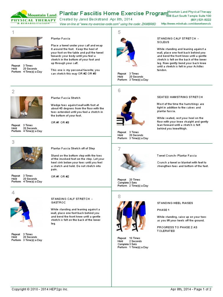 Web 2 orthoinfo basics — plantar fasciitis how is plantar fasciitis treated? Web plantarfasciitis home exercise program. When treated early, most plantar fasciitis symptoms can be resolved with simple methods. Web the plantar fascia is a sheet or broad band of fibrous tissue that runs along the bottom of the foot. Plantar fasciitis is aggravated by tight muscles in your feet and calves. Web plantar fasciitis rehabilitation exercises heel raises while standing near a counter top, raise up on your toes as you lift your heels off the ground. Maintain a good upright posture. Web information and exercise sheet plantar fasciitis plantar fasciitis causes pain around the heel, arch and bottom of the foot. Sit with involved leg straight out in front of you. Last updated june 11, 2023.