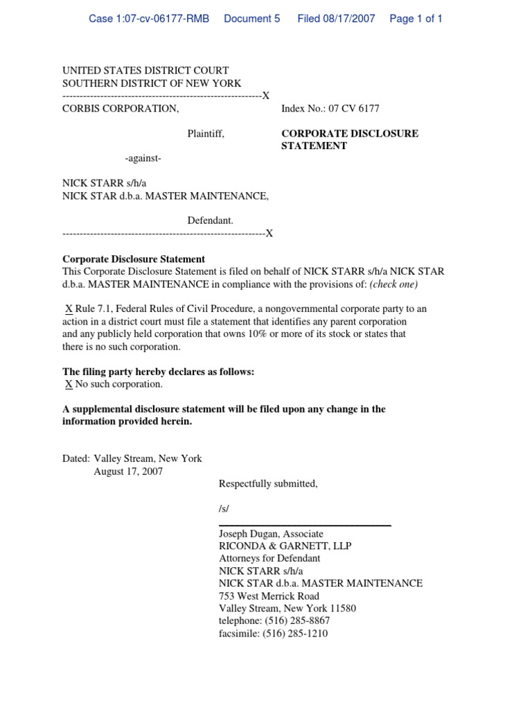 Web federal rule of civil procedure 7.1 (a) (2) disclosure form attorneys representing a party or intervenor in a diversity action are reminded of their duty,. Web civil form 4, sample disclosure statement amended 12/1/13 united states district court district of new hampshire plaintiff(s) v. Web a sample disclosure statement filed by a party or intervenor in a federal civil lawsuit under rule 7.1 of the federal rules of civil procedure (frcp) disclosing the. Application to bring an electronic device into the courthouse; A nongovernmental corporate party must file 2 copies of a disclosure statement that: Disclosure statement (a) who must file; After logging in to cm/ecf with the filing attorney’s cm/ecf account, select civil from. Joint motion regarding continued sealing forms;. A nongovernmental corporate party or a nongovernmental corporation that. Rule 7.1 disclosure statement event in cm/ecf will be modified on march 28, 2022, to.