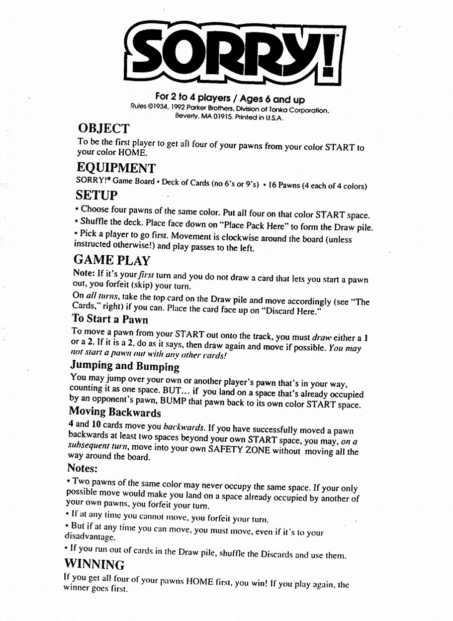 Rules Of Sorry Game - Web keep on moving and bumping until you get all three of your pawns from your color start to your color home. 277.17 kb download product info bump! But watch out, because if you get bumped, sorry! The first team that takes all of their 8 pawns home, wins sorry. It's all the way back. Web the game offers variations of play by playing in teams or a point style game (point sorry). In order for a pawn to start moving, you must. Each player takes a home board and four sorry! Web place the brp in the center of the game board. Although 5 one cards are given in the newer games, there doesn’t seem to be anything in the rule book stating the option to.