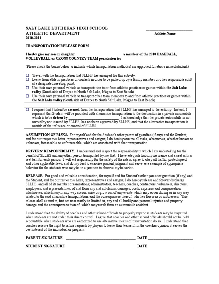 Web please read this form carefully and be aware that in consideration for the winfield township senior and/or disabled transportation services, you will be expressly assuming the risk and legal liability and waiving and releasing all claims for injuries, damages or loss which you might sustain as a result of said services, including but not limited. Web transportation release form understand that the forsyth county board of education will provide transportation to and from the following activity: This article allows you to know everything you need to know about transportation requests and provides you with sample forms that you can use and download for free. Due to covid, parent/guardians may transport their child to. Permission for my student to ride with parent Web transportation release form this form must be properly completed, signed and returned to the athletic office at least one day prior to the extracurricular activity in order to obtain the release of a child from the transportation provided. Web a transport request is a formal request made when certain goods are subject to be moved or transportation from one point to another. If any of the material on this page is not accessible to you or you have questions, please send us an email or call us via our contact page and we will provide alternatives. When this occurs, westminster college requires that the student sign the private transportation release consent form that appears below: Web private transportation release consent form at times it becomes necessary to use private vehicles to transport students to and from westminster college activities.