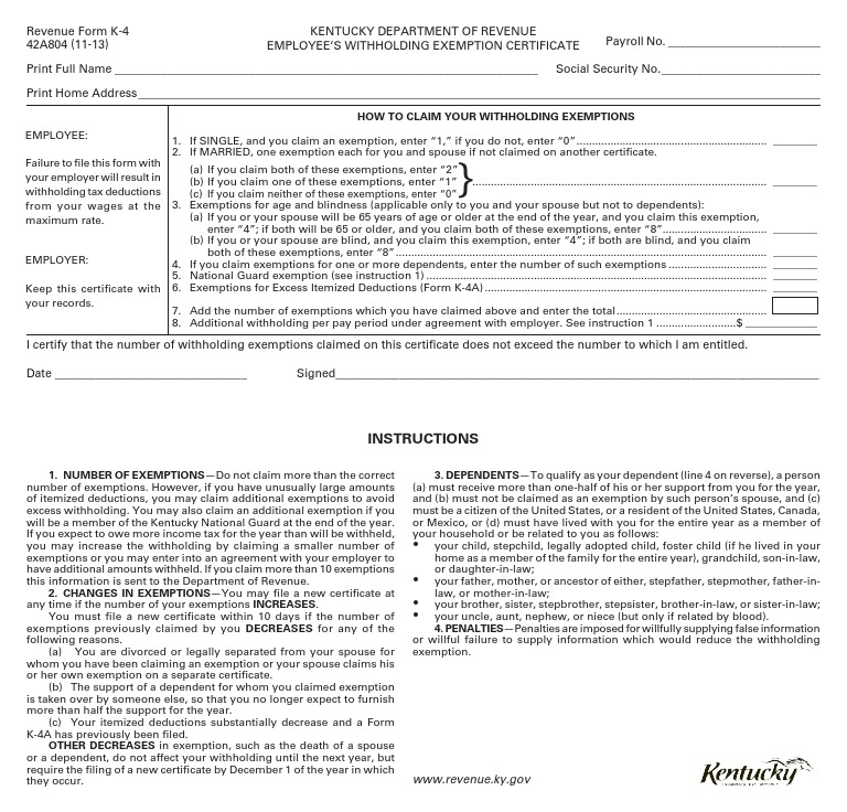1999 KY DoR 42A804 Form K4 Fill Online, Printable, Fillable, Blank