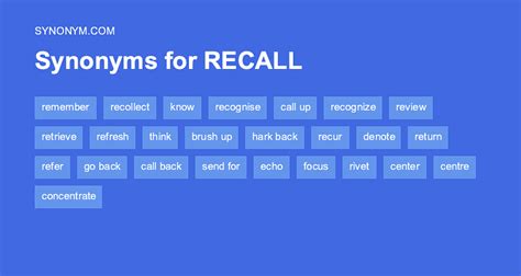 Synonyms for recall (other words and phrases for recall). Another way to say recall? Web find 3,126 synonyms for recall and other similar words that you can use instead based on 27 separate contexts from our thesaurus. Web find 97 different ways to say recall, along with antonyms, related words, and example sentences at thesaurus.com. Remember, recollect, mind, think (of), reproduce, remind, reminisce (about),.