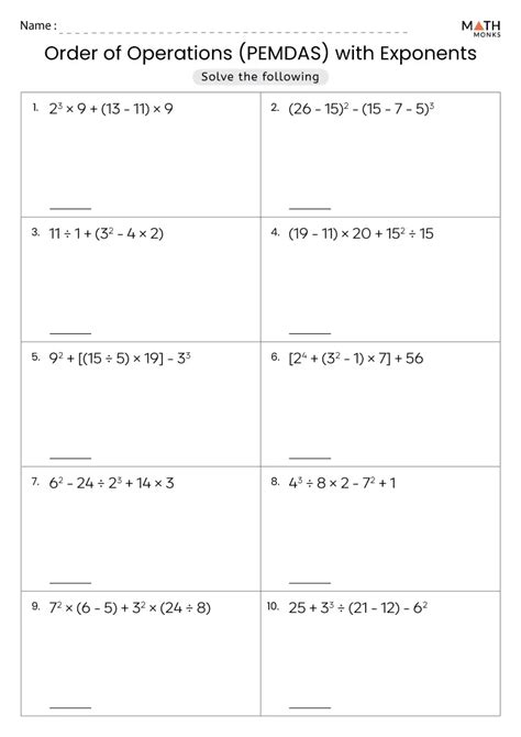 The purpose of excluding some parts of pemdas is to ease students into. The purpose of excluding some parts of pemdas is to ease students into. Web exponents, subtraction, and division are excluded. These order of operations worksheets include the 4 operations, parenthesis and exponents. Web order of operations with exponents worksheets can help students to understand the order in which they are applied to.