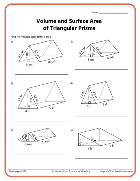Volume and Surface Area of Triangular Prisms (A) Measurement Worksheet